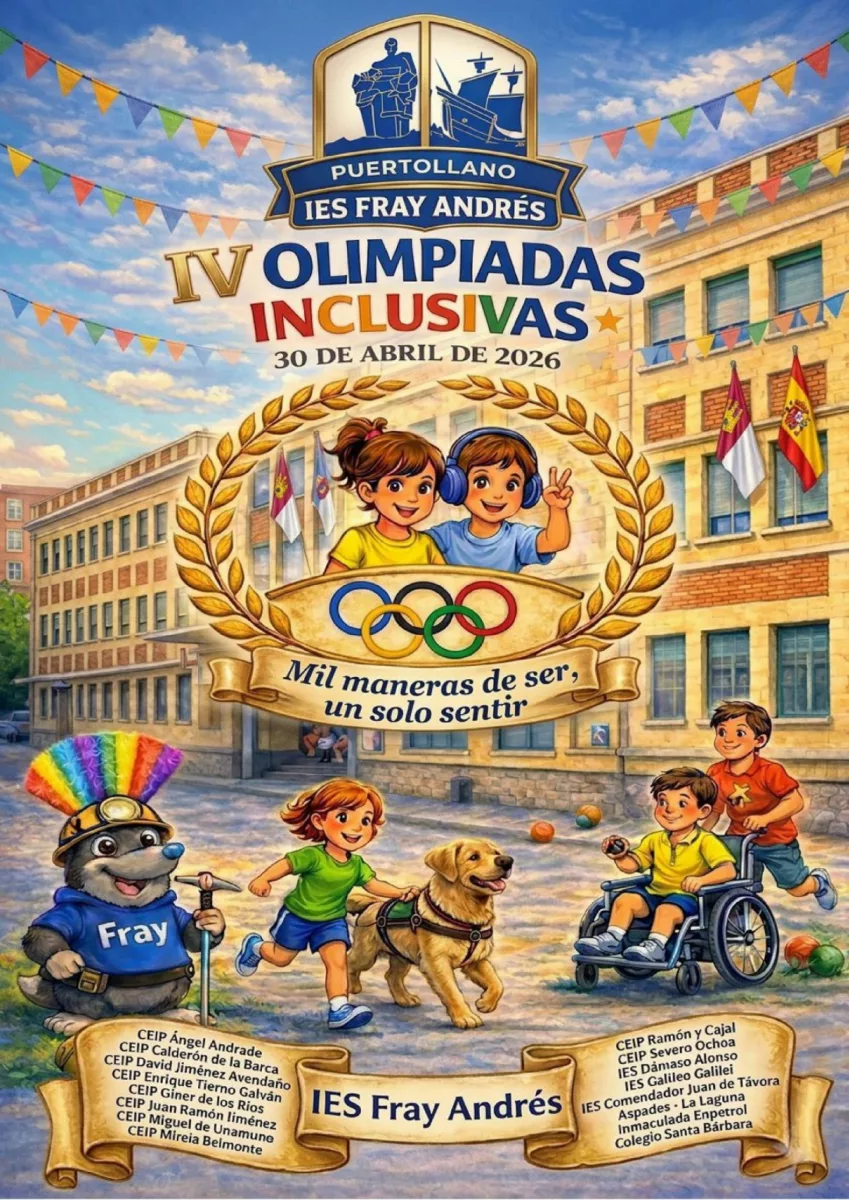 Trescientos cincuenta alumnos de diecisiete centros educativos participarán jueves, 30 de abril, en el Instituto Fray Andrés en las cuartas Olimpiadas Inclusivas, en una jornada deportiva, de convivencia, aprendizaje y emoción, en el que Puertollano volverá a ser un referente en valores educativos y sociales.