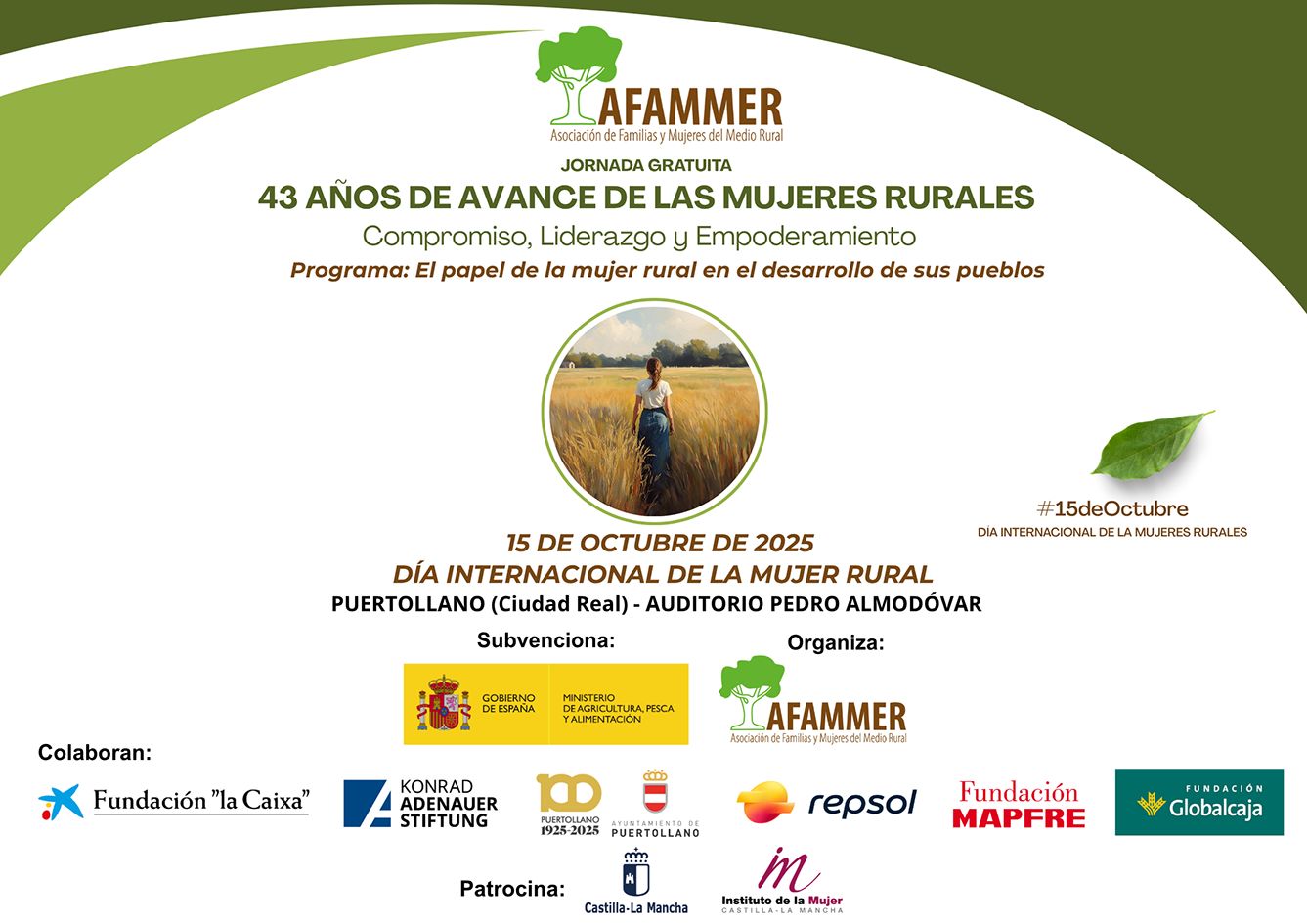 Una jornada que estará presidida por S.A.R La Infanta Elena y que cuenta con el apoyo de administraciones y entidades que han querido unirse a la Conmemoración de este día tan importante en la vida de AFAMMER y de las mujeres rurales de toda España, entre ellas: Fundación “La Caixa”; Konrad Adenauer Stiftung; Ayuntamiento de Puertollano; Complejo Industrial de Repsol en Puertollano; Fundación MAPFRE; Fundación Globalcaja Ciudad Real y Diputación de Ciudad Real y el patrocinio del Instituto de las Mujeres de la Junta de Comunidades de Castilla-La Mancha.