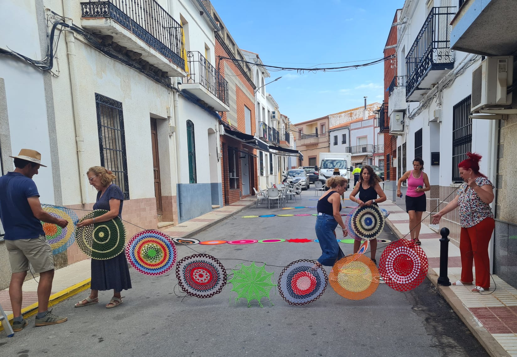 Durante semanas, los hogares de muchas vecinas y vecinos han sido auténticos talleres de creatividad, que a base de paciencia, destreza y cariño, han tejido decenas de rosetones de colores vivos que se van instalando en las calles del municipio, transformando su imagen habitual en un espacio festivo, alegre y lleno de identidad local.