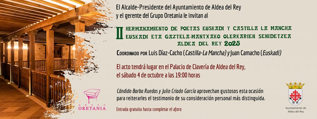 El alcalde de Aldea del Rey, Cándido Barba Ruedas, da la bienvenida a los componentes del II Hermanamiento Oretania de Poetas de Euskadi y Castilla- La Mancha y destaca el patrimonio de la localidad, “Aldea del Rey os acoge con los brazos abiertos, queremos que disfrutéis de nuestro milenario patrimonio, tenemos veinticuatro núcleos volcánicos que próximamente se pondrán en valor a través de nuestro ‘Centro de Interpretación del Geoparque Volcanes de Calatrava’, que estará situado en nuestro espectacular Palacio de Clavería, uno de los palacios renacentistas más hermosos y desconocidos de Castilla-La Mancha, que hemos puesto a vuestra disposición para que celebremos el acto principal del Hermanamiento”.