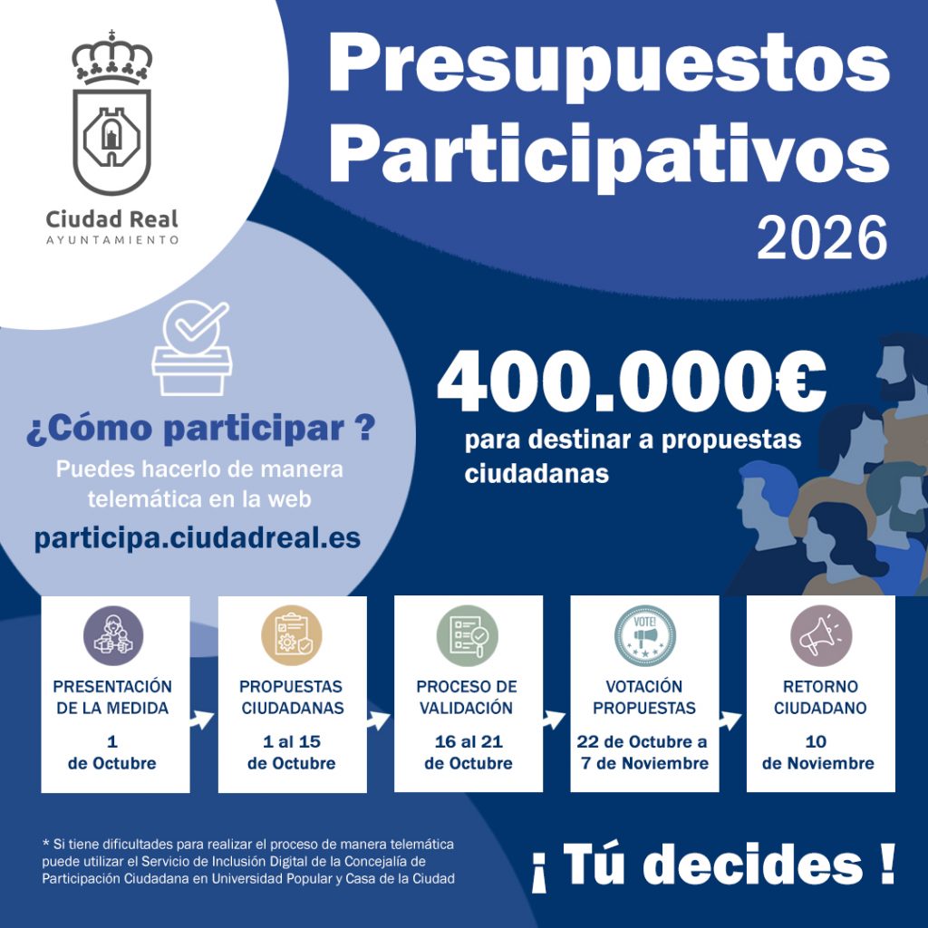 Por primera vez, el Ayuntamiento de Ciudad Real invertirá 400.000 euros en los proyectos que presenten y seleccionen los propios vecinos de la capital. El plazo de presentación de iniciativas se abrirá desde el 1 al 15 de octubre y las votaciones para la selección de proyectos se podrán hacer entre el 22 de octubre y el 7 de noviembre.