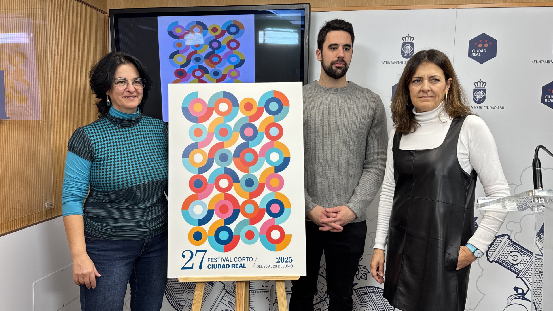 La 27 edición del Festival Corto de Ciudad Real ya tiene imagen: “Cinemática”, creación del diseñador gráfico Alberto León. El concejal de Juventud, Pau Beltrán, y las codirectoras del Festival, Blanca Sáenz y Pepa Gómez, han sido hoy los encargados de presentar la propuesta gráfica seleccionada por el jurado de entre los 86 trabajos que participaron en el concurso llegados de toda España, 20 de ellos de Ciudad Real. Una creación “abstracta pero muy evocadora”, así la ha definido su autor.