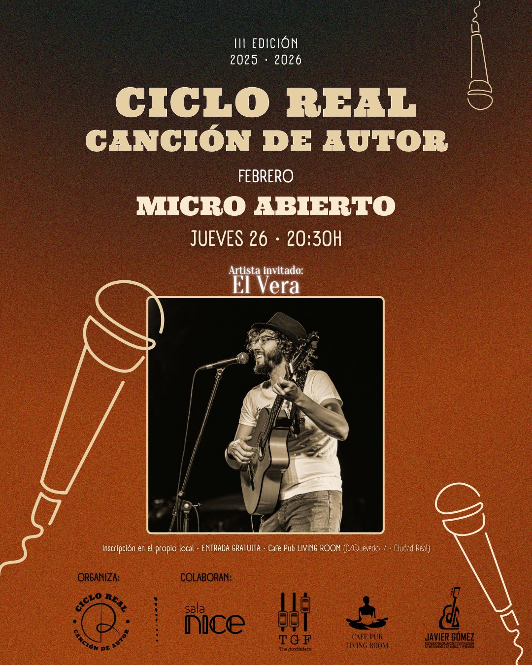 El Ciclo Real despide febrero con uno de sus tradicionales y ya implementados en la ciudad, micro abierto. Una oportunidad para que cantautores, músicos emergentes y artistas de cualquier disciplina compartan sus composiciones en un ambiente cercano e íntimo. La inscripción podrá realizarse en el propio local antes del inicio del evento. Este micro estará presentado por el cantautor ciudarrealeño Lewismi, encargado de conducir la velada y dar paso a los distintos participantes como ya es costumbre.