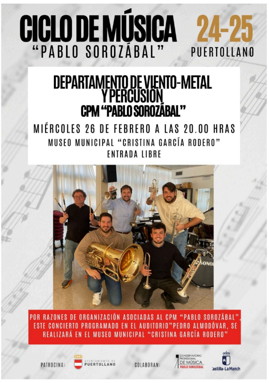 El Departamento de Viento Metal y Percusión del CPM “Pablo Sorozábal” ofrecerá un concierto el próximo día 26 de febrero a las 20 horas en el museo municipal “Cristina García Rodero” con motivo del Ciclo de Concierto “Pablo Sorozábal” 24 – 25 que se está desarrollando este año en la localidad de Puertollano.