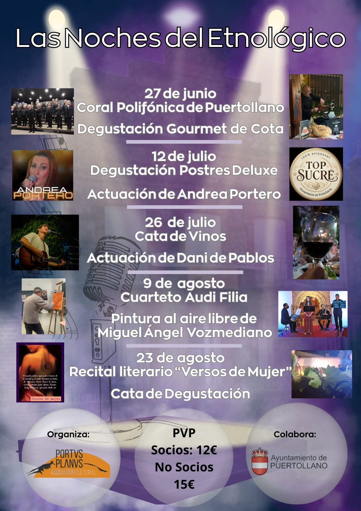 Degustaciones gastronómicas y de vinos, actuaciones de la Coral Polifónica, cuarteto Audi Filia, Andrea Portero y Dani de Pablos, pintura al aire libre y recital literario serán algunas de las propuestas culturales de la asociación Portus Planus en las “Noches del Etnológico”.