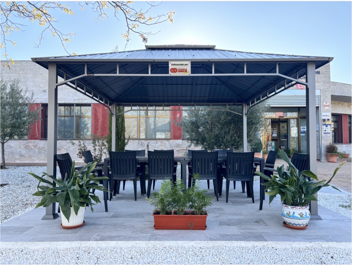 El proyecto ha consistido en la adecuación integral del entorno exterior, incluyendo la renovación del pavimento y la creación de una nueva zona de sombra mediante la instalación de una pérgola. Este nuevo espacio está concebido como un área para el ocio, el descanso y la convivencia, favoreciendo la participación y el bienestar de las personas usuarias.