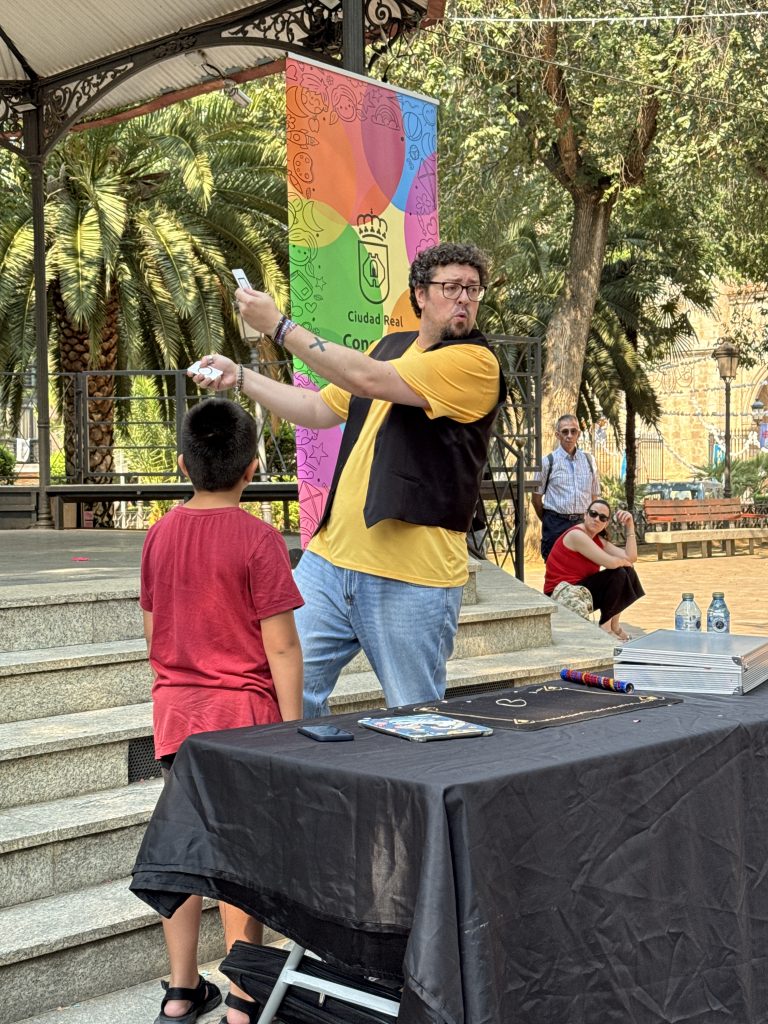 Los niños y niñas de Ciudad Real han vivido hoy una mañana ilusionante en los Jardines del Prado. Como parte de la programación de actividades organizadas por la concejalía de Infancia con motivo de la Feria en honor a la Virgen del Prado, el Pandorgo 2025, Dani Rodríguez, ha ofrecido un espectáculo de magia pensado para el disfrute de toda la familia, desde los más pequeños hasta los mayores. Una propuesta que Dani Rodríguez ha creado “para que se diviertan todos los que vengan”, en la que los asistentes han acabado convirtiéndose en los protagonistas de los trucos y juegos, con elementos clásicos como cartas, pañuelos, etc.