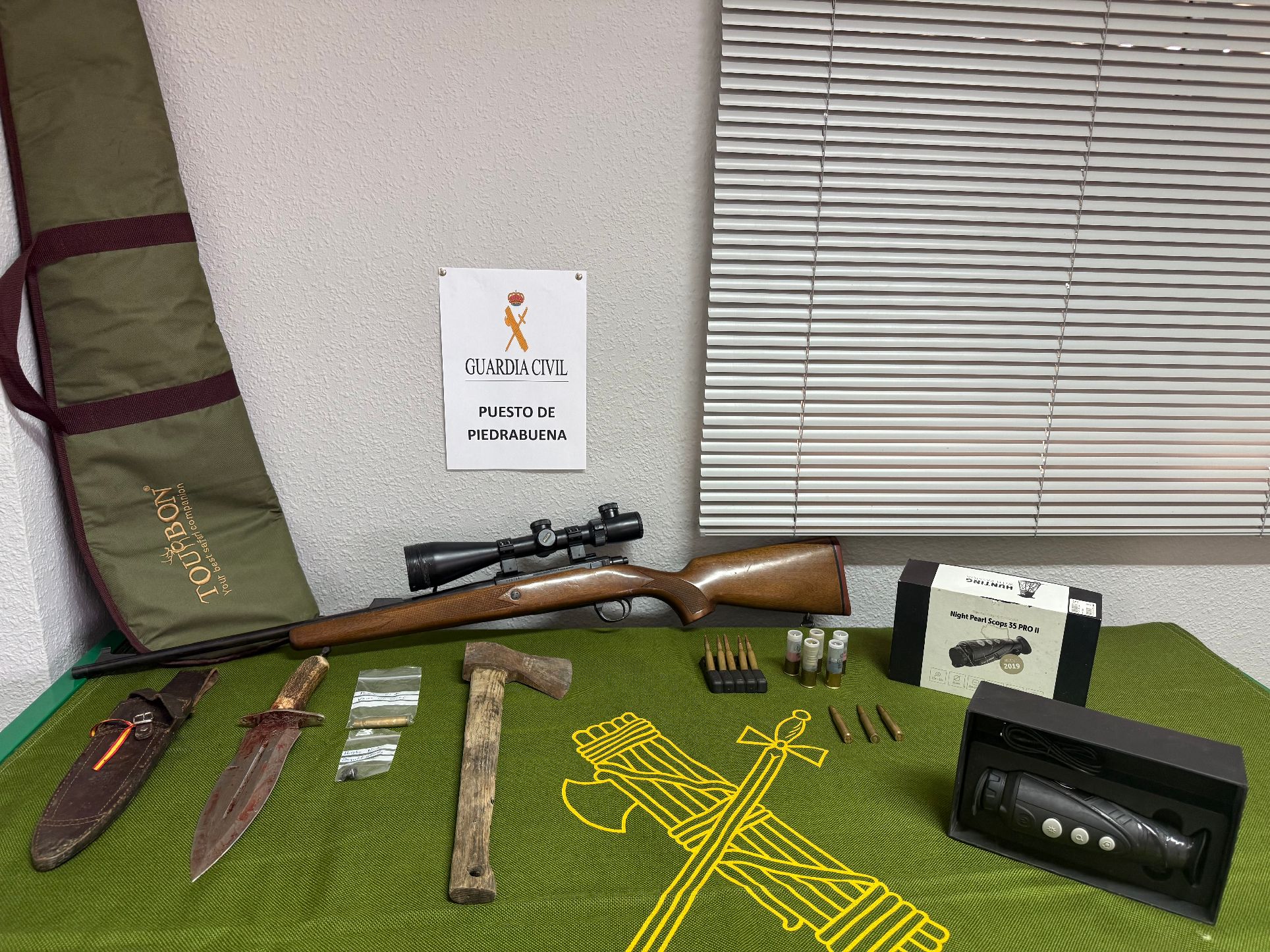 La patrulla logró interceptar un vehículo, el cual iba ocupado por dos personas. Tras la identificación de sus ocupantes se observa que portan en los asientos traseros del vehículo un arma de fuego larga, por lo que se realiza un registro de dichas personas y su vehículo, hallando un arma larga de fuego que monta un visor de largo alcance, la cual se encontraba con cartucho en recámara y lista para disparar, además de hallar un visor térmico, un cuchillo de remate impregnado de sangre y pelo de animal, 5 balas de rifle, 4 cartuchos de bala del calibre 12, un hacha, dos balas del calibre 30-06 que portaba el acompañante en el bolsillo de su chaqueta, dos linternas de grandes dimensiones, una linterna frontal, además de hallarse en el suelo del asiento del acompañante una vaina del calibre 30-06 recién disparada. Añadir que, además, se le interviene una bolsa transparente que contiene en su interior hachís.