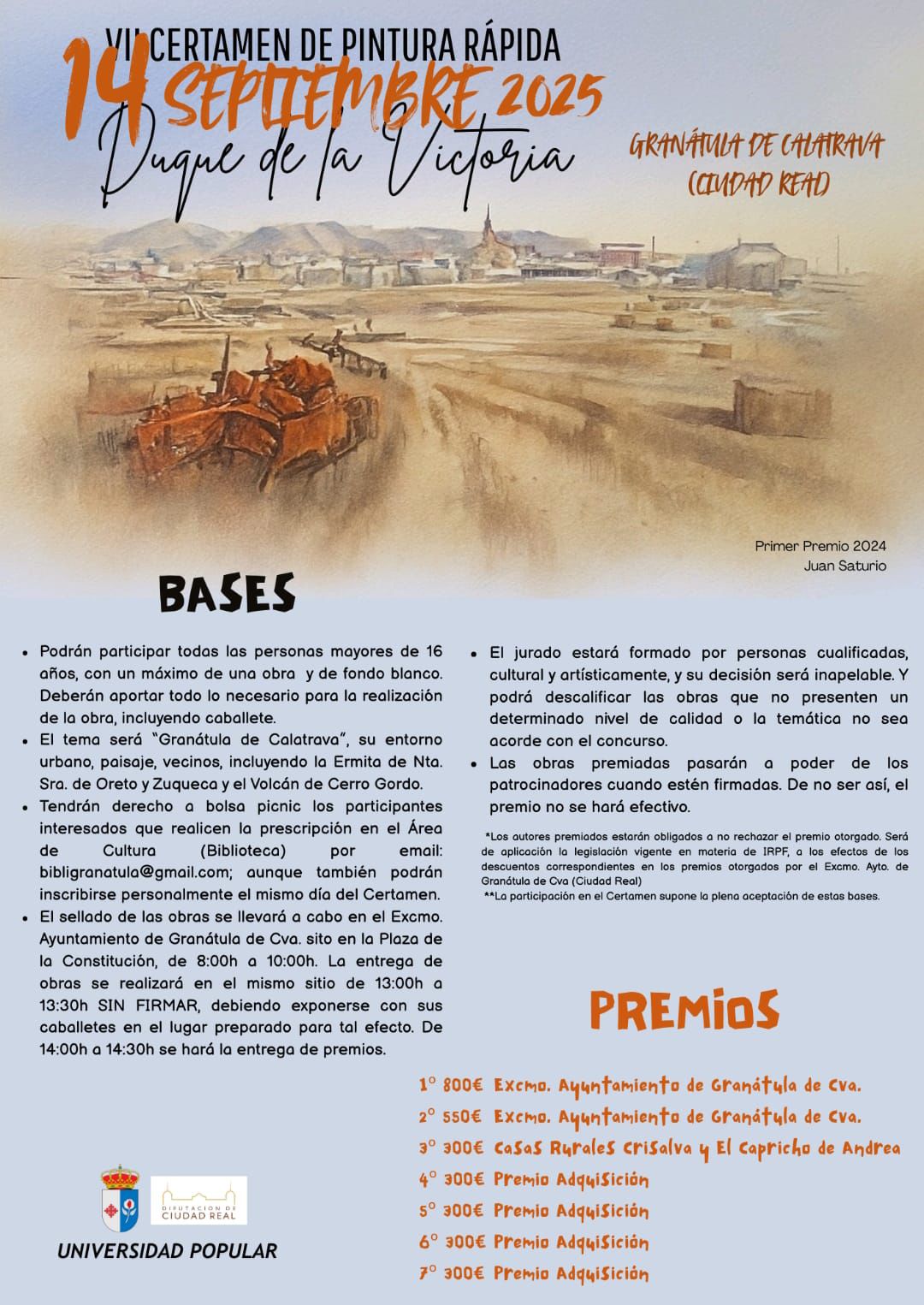El Ayuntamiento de Granátula de Calatrava (Ciudad Real) convoca el 7º Certamen de Pintura Rápida “Duque de la Victoria”, que se celebrará el próximo 14 de septiembre, desde las 8 de la mañana, y que reparte jugosos premios por una cuantía total de casi 3.000 euros.