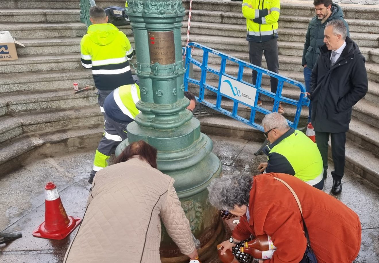 Este resultado ha motivado una segunda intervención para revisar el nivel freático en el compartimento estanco por el que se distribuye el agua del manantial al exterior. Así, este miércoles, utilizando una cámara endoscópica, se ha accedido al interior de la cuba a través de la columna central de la fuente, alcanzando el recipiente que reparte el agua a los cuatro caños. «Esta operación ha permitido confirmar que el nivel del agua apenas alcanza la salida de los conductos y ahora sabemos con precisión dónde se encuentra el nivel del agua», ha detallado el alcalde.