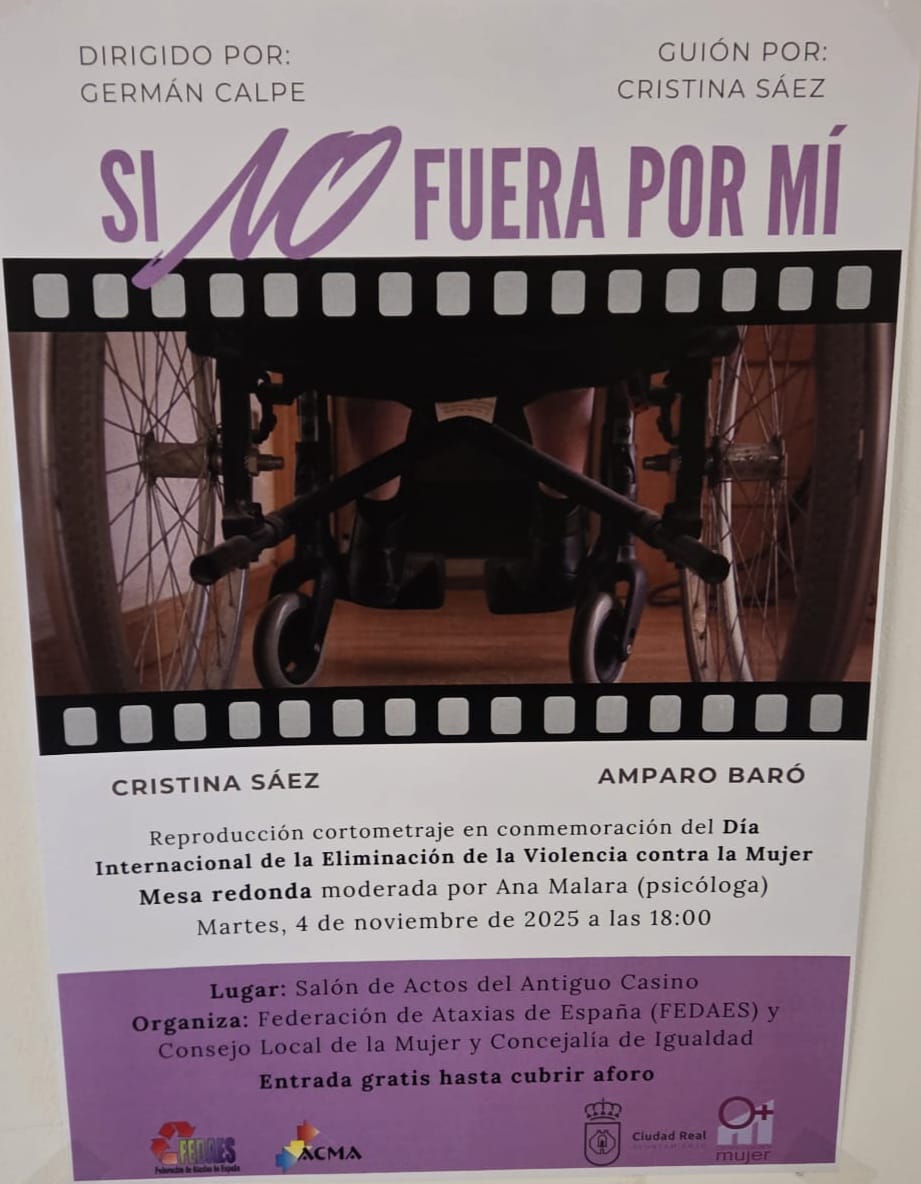 Anselmo Alañón Alcaide.- Mañana martes, 4 de noviembre en el Antiguo Casino de Ciudad Real, con motivo del Día Internacional de la eliminación de la violencia contra la mujer, se proyectará el cortometraje «Si no fuera por mi», con guión de Cristina Sáez, dirigida por Germán Calpe. Este cortometraje esta protagonizado por Amparo Baro y Cristina Baro.