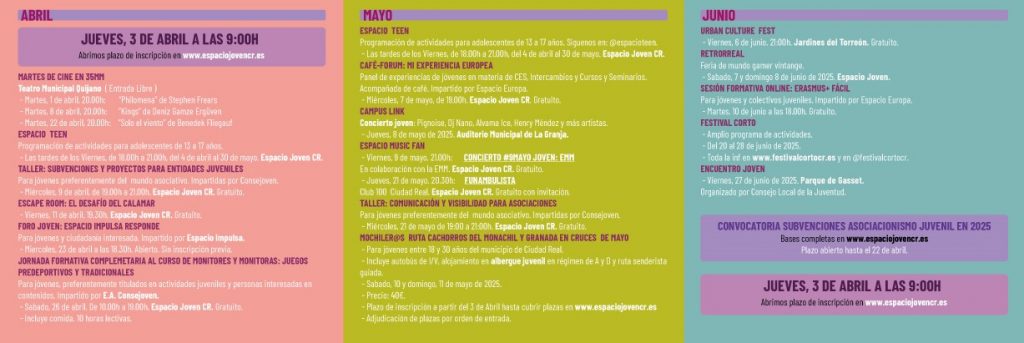 La Agenda Joven de Primavera 2025 incluye una amplia programación de conciertos, actividades culturales, formación y ocio, con un incremento del 25% en las ayudas a asociaciones juveniles y una dotación de 30.000 euros para el Festival Corto, que bate récords de participación.