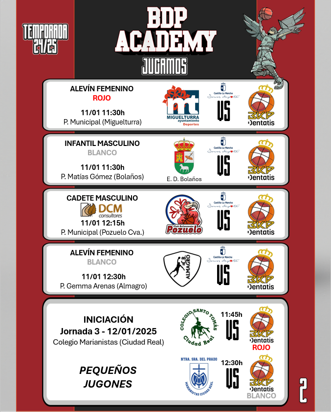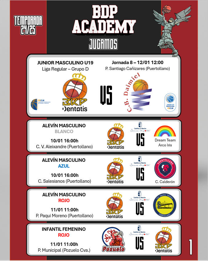 La BDP Academy también reanudará a sus competiciones a partir de la tarde del viernes, con 9 equipos en liza durante todo el fin de semana, que finalizará con Iniciación el domingo por la mañana en Ciudad Real, en una nueva jornada de Pequeños Jugones.