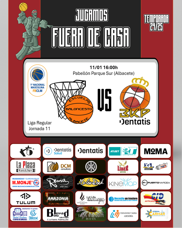 El primer equipo de 1ª Nacional lo hará a lo grande. Tendrán cita en el Pabellón Parque Surde Albacete donde les esperará EBA (Escuelas Baloncesto Albacete) el sábado a las 16:00h. Tremendo partido ante un grandísimo rival que tendrá como premio para el vencedor un billete para la Copa de 1ª Nacional. Ambos llegan al encuentro con el mismo casillero de victorias y derrotas (6-4) e idéntica racha (2 victorias consecutivas).