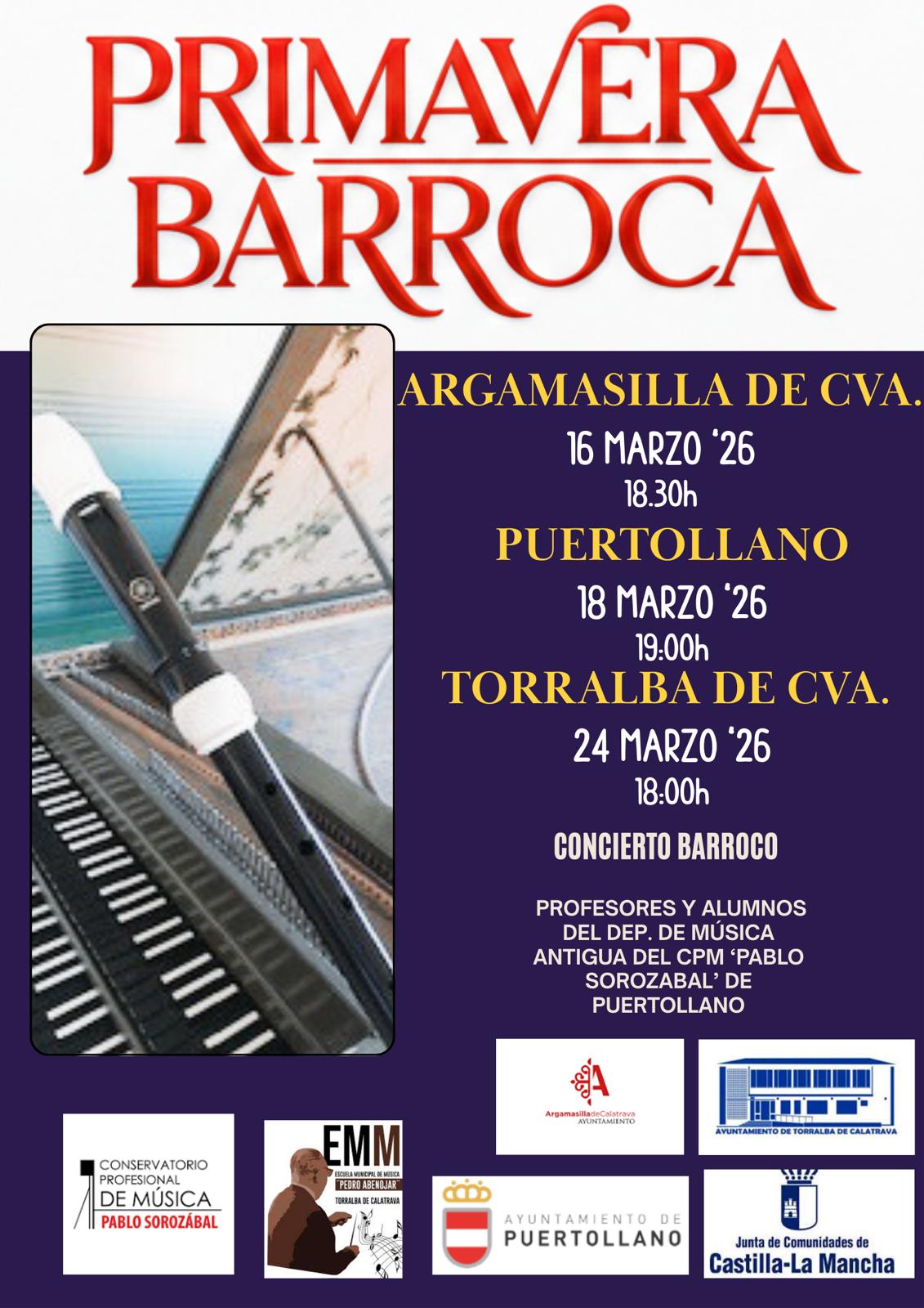 La próxima semana se iniciará el Ciclo de conciertos «Primavera Barroca» a cargo del profesorado y alumnado del Departamento de Música Antigua del CPM Pablo Sorozábal, en él se incluyen los conciertos de repertorio barroco que se ofrecerán los días 16 de marzo en Argamasilla de Calatrava a las 18:30 horas en el Centro Cultural “La Bodega”, el 18 de marzo a las 19:00 horas en el Museo “Cristina García Rodero” de Puertollano y el 24 de marzo a las 18:00 horas en el Patio de Comedias “Sala de Cerchas” de Torralba de Calatrava.