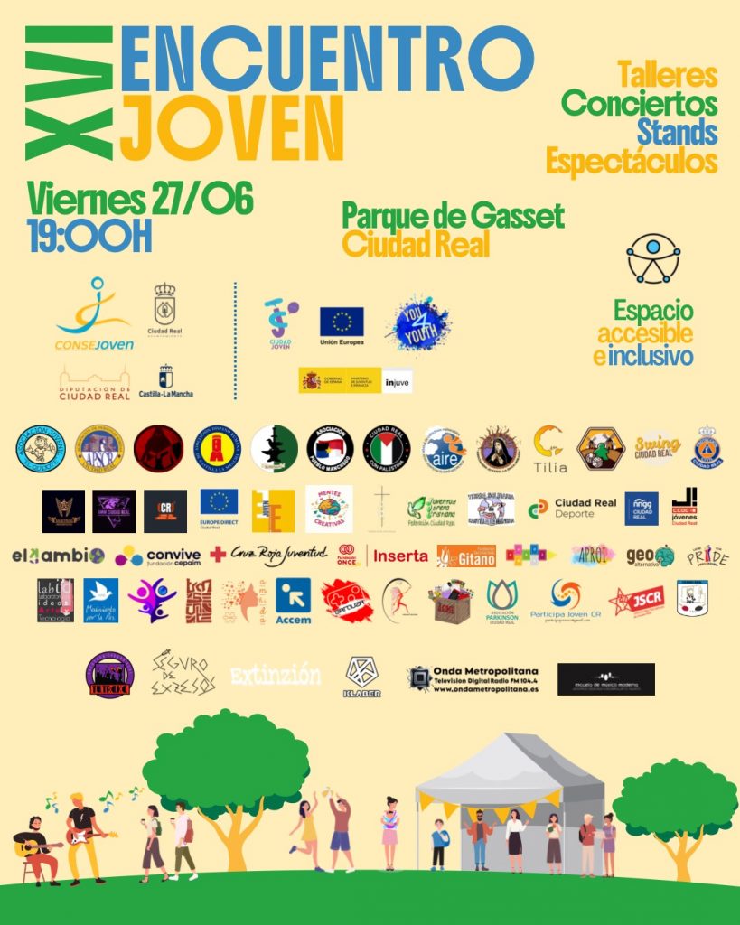El Consejo Local de la Juventud y la concejalía de Juventud del Ayuntamiento de Ciudad Real celebran este viernes 27 de junio la decimosexta edición del Encuentro Joven. Una cita a la que este año se han sumado más de cincuenta colectivos que estarán presentes desde las 19:00 horas en el Parque Gasset, con información en sus estands, talleres, espectáculos y conciertos.