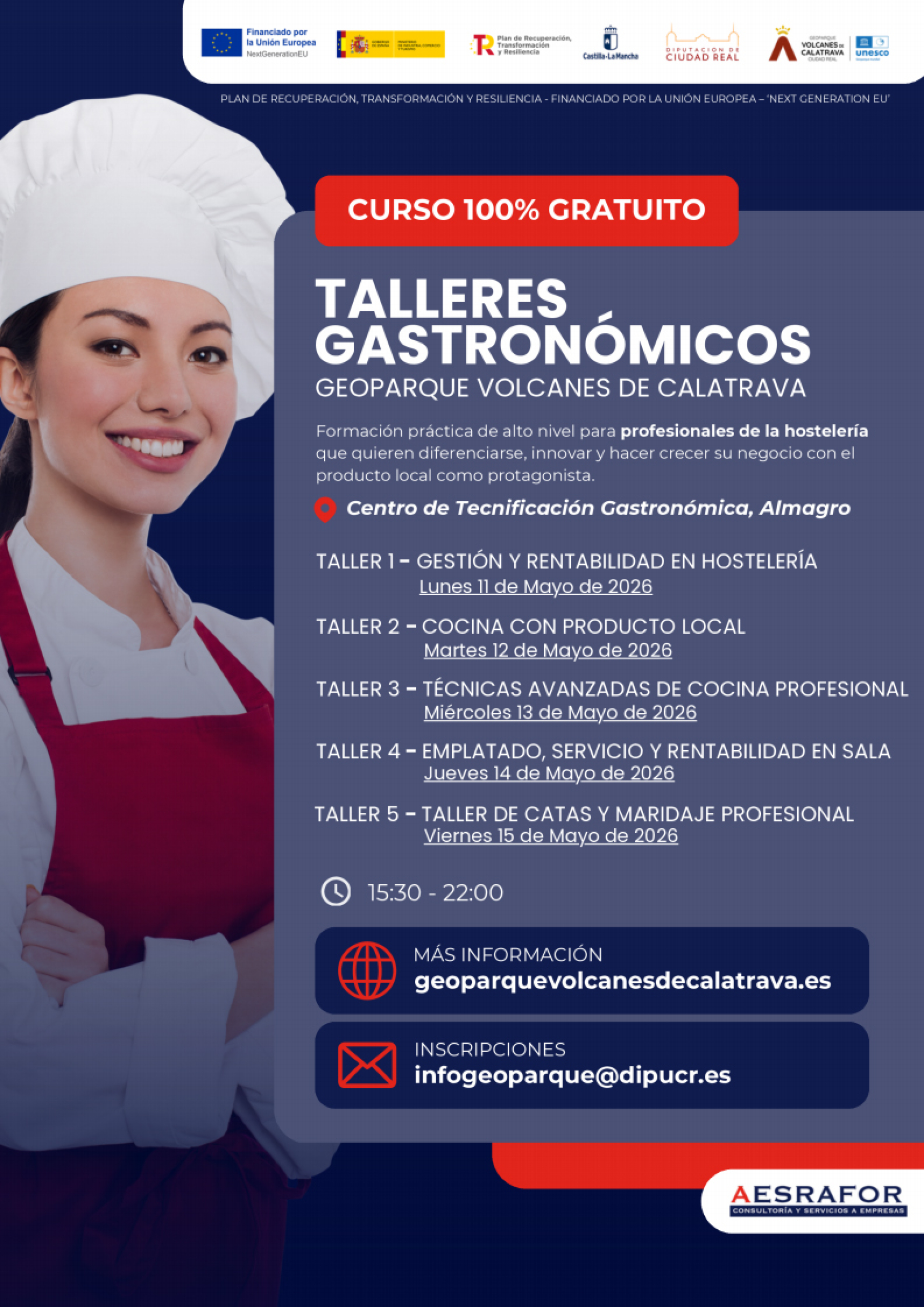Ya se puede solicitar plaza a través del formulario de inscripción que se encuentra en la página web del Geoparque Volcanes de Calatrava https://geoparquevolcanesdecalatrava.es/inscripcion-talleres-gastronomicos-geoparque-volcanes-de-calatrava/ y su remisión al correo electrónico infogeoparque@dipucr.es. El plazo de inscripción estará abierto hasta el día 6 de mayo de 2026.