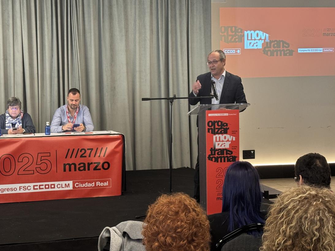 Durante el congreso, el consejero ha estado acompañado por el director general de Función Pública, José Narváez; la delegada provincial de Hacienda, Administraciones Públicas y Transformación Digital, Inmaculada Jiménez; el secretario general de CC.OO. en Castilla-La Mancha, Paco De la Rosa; la secretaria de la Unión Provincial de CC.OO. en Ciudad Real, Esther Serrano; la secretaria de Comunicación, Mujeres e Igualdad del FSC-CC.OO., Enma Real; la secretaria estatal de Acción Sindical y coordinadora de Gabinete Técnico y Jurídico, Silvia Rodríguez; y responsables de las Uniones Provinciales de Comisiones Obreras de Castilla-La Mancha.