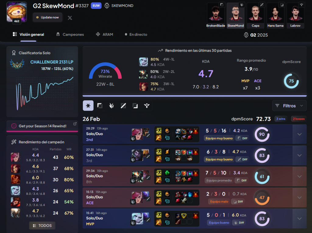 SkewMond está siendo clave en G2 Esports, ya clasificado a la final de LEC con un gran nivel, pero es que además en soloQ muestra datos brutales con un KDA abrumador (medias de 7 asesinatos y solo 3 muertes, por ejemplo) y un winrate de más del 70% en las últimas 30 partidas.