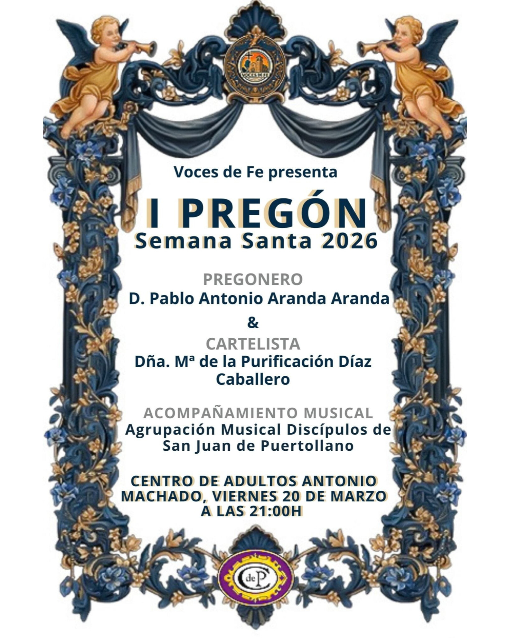 El centro de adultos Antonio Machado de Puertollano acogerá el 20 de marzo, a las 21.00 horas, el I pregón Cofrade de «Voces de Fe» y la presentación del cartel de la Semana Santa, con el acompañamiento musical de la agrupación Discípulos de San Juan. El acto estará dirigido por Fernando Delgado Rosa y patrocinado por Cofrades de Pasión.