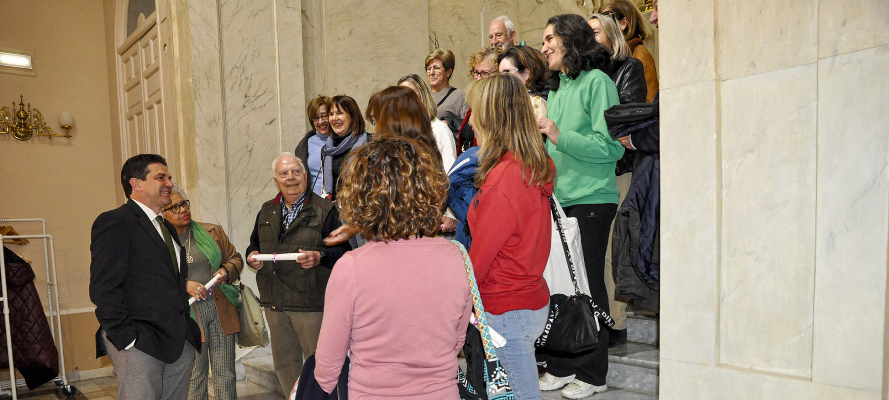 El presidente de la Diputación de Ciudad Real, Miguel Ángel Valverde, ha saludado esta mañana a varios grupos que han visitado el Palacio Provincial con motivo de la exposición “Felipe VI 2014-2024: Una década de la historia de la Corona de España”. Entre los asistentes, se encontraban alumnos del Centro de Educación de Personas Adultas “Antonio Gala” de Ciudad Real, quienes, además de recorrer la muestra, han visto las salas más representativas del Palacio Provincial, por lo que han podido apreciar su riqueza artística y arquitectónica.