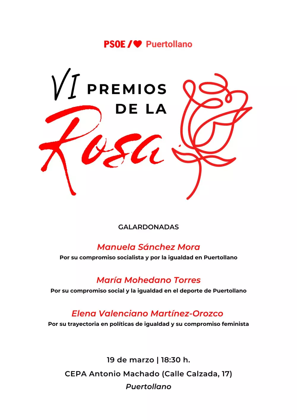 Enmarcados dentro de la conmemoración del 8 de Marzo, Día Internacional de la Mujer, la Agrupación Socialista de Puertollano celebra la VI edición de los ‘Premios de la Rosa’. ​Con estos galardones, el PSOE quiere reconocer la labor de mujeres que, a nivel local, regional y nacional, han dedicado gran parte de sus vidas a promover la igualdad de oportunidades entre hombres y mujeres. Según ha explicado la Secretaria de Organización e Igualdad, Ana Belén Mazarro, estos premios ponen en valor la implicación de vecinas de Puertollano que han derribado barreras y roto techos de cristal. “Mujeres que a su manera y desde sus barrios, asociaciones y entidades mueven el mundo convirtiéndose en referentes para las mujeres puertollaneras”, ha señalado.