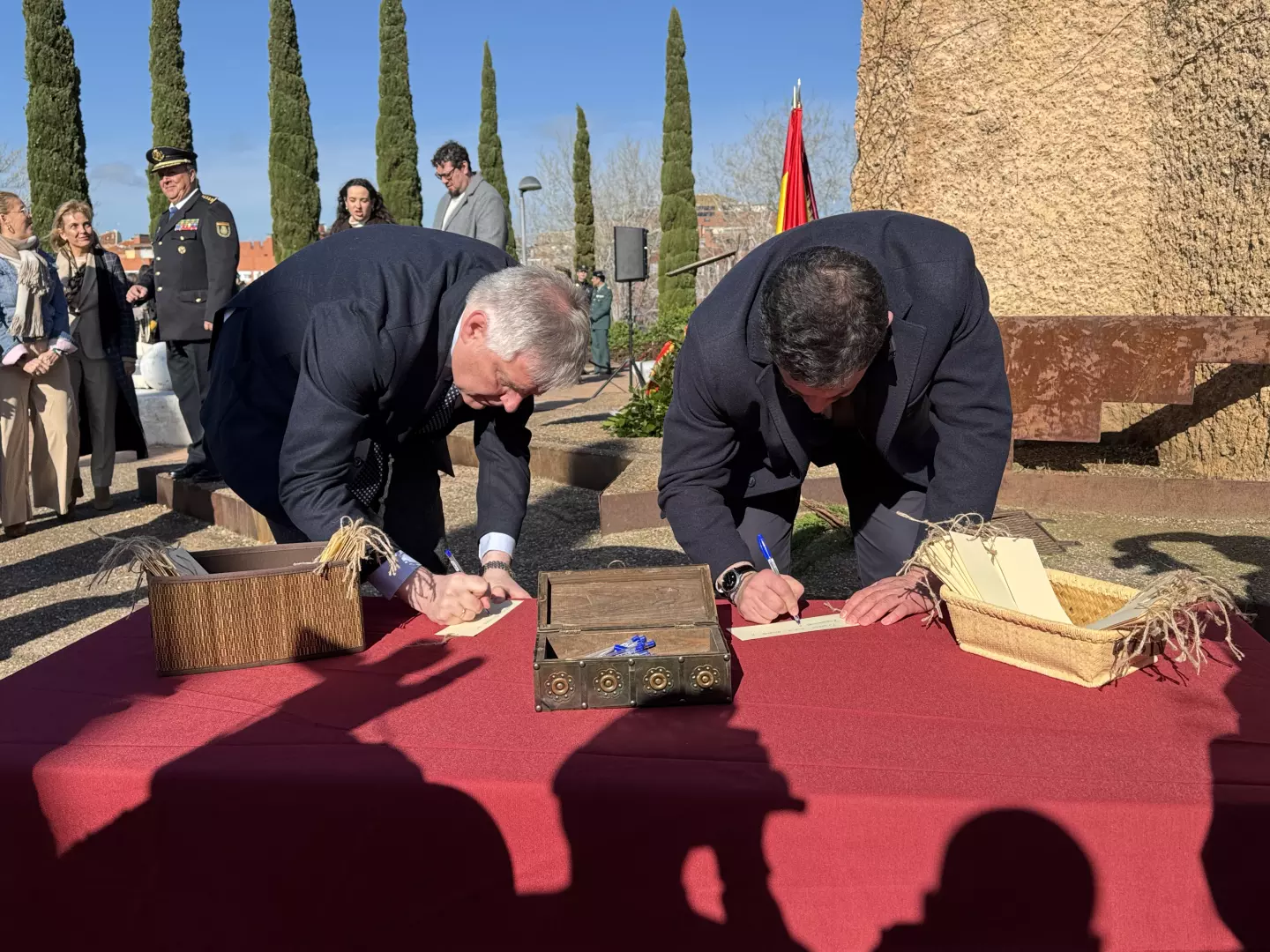 Francisco Cañizares y Miguel Ángel Valverde iniciaban el acto depositando una corona de laurel bajo la placa conmemorativa del monumento en memoria de los atentados del 11M. Después, el Pandorgo, Daniel Rodríguez, y la Dulcinea 2026, María Cieza, como representantes de los ciudadanos, han sido los encargados de dar lectura al manifiesto elaborado con motivo del Día Europeo en recuerdo de las Víctimas del Terrorismo que se conmemora cada 11 de marzo. Para finalizar, los asistentes han podido depositar una nota manuscrita con sus deseos en el “olivo de la memoria”.
