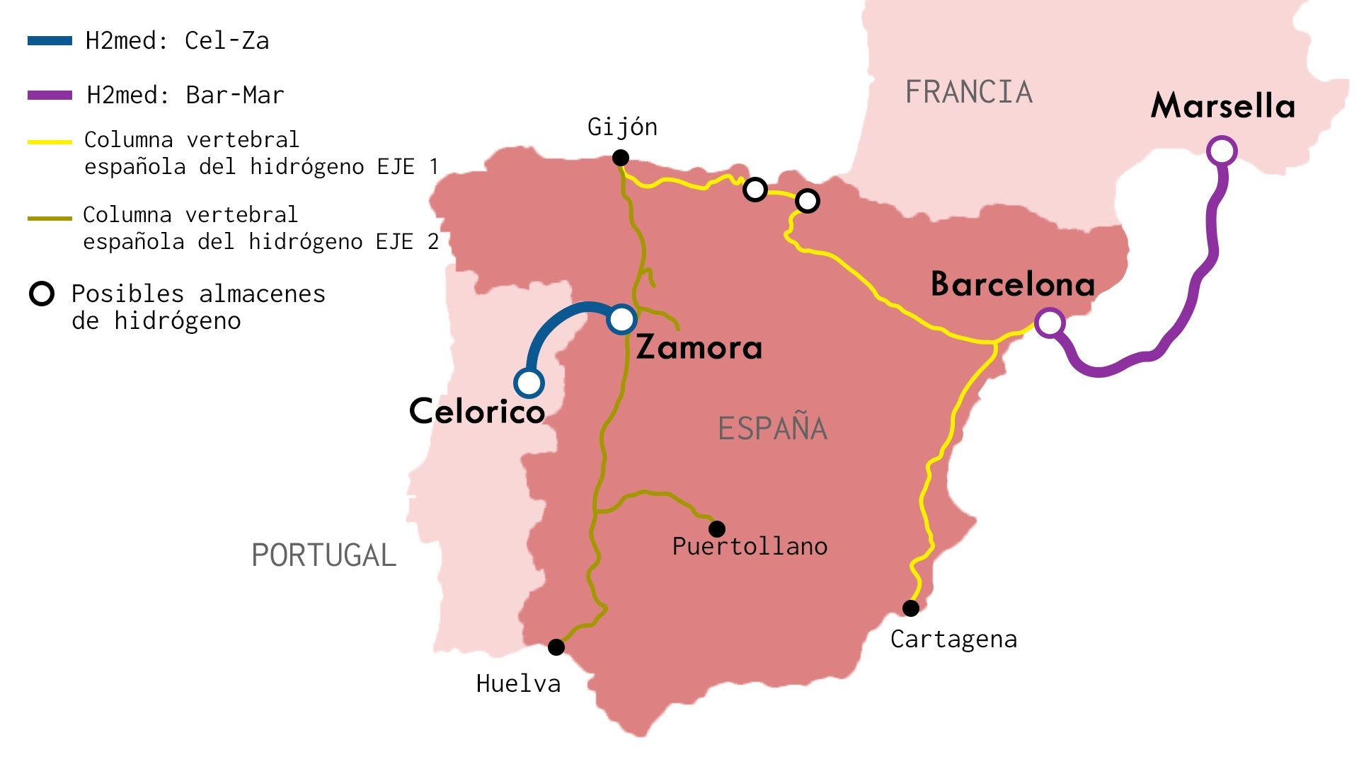 El corredor H2Med está formado por una conexión entre Celorico da Beira en Portugal y Zamora en España (CelZa) y una conexión marítima entre Barcelona y Marsella (BarMar).