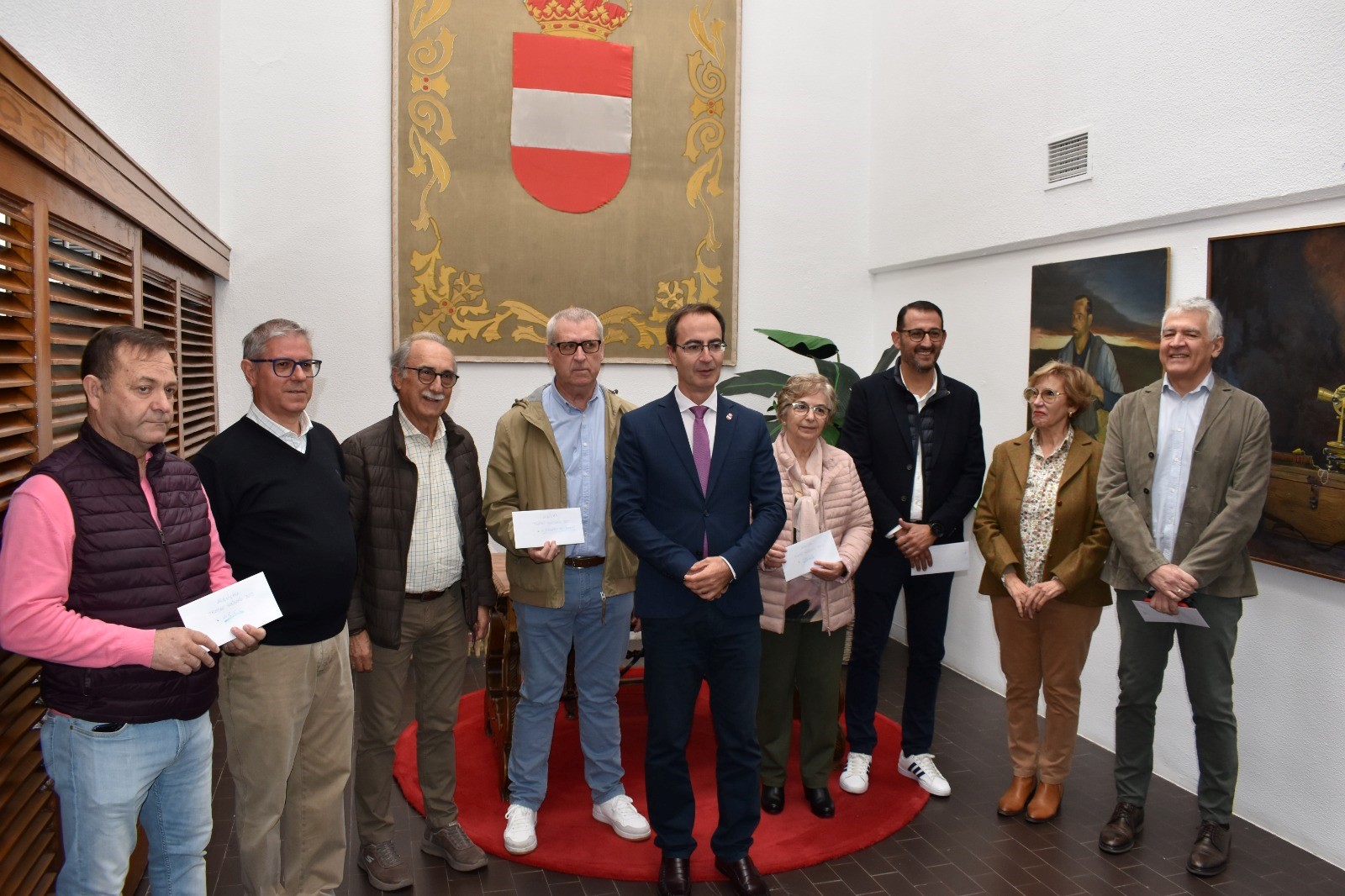 El concejal de cultura del ayuntamiento de Puertollano D. Juan Sebastián Lopez Berdonces junto al representantes de la junta directiva de ARQUICMA, D. Carlos Vizcaino (Tesorero) y D. Juan Ramon Alvarez (Presidente) han hecho entrega de la recaudación obtenida, en el ayuntamiento de Puertollano a los representantes de Cáritas, Asociación Española Contra el Cáncer, Fundación Fuente Agria, Hermandad de
