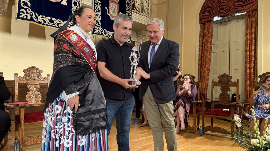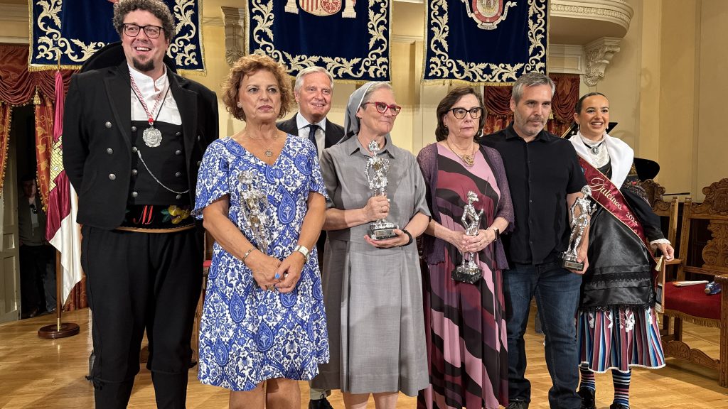 Mariola Mayor (hija de José Mayor), Adrián Blasco (viudo de Conchi Sánchez), Cristina Villar (viuda de Carlos de la Torre) y María Luisa Duro (superiora provincial de la Congregación de religiosas de María Inmaculada) han sido los encargados de recibir de manos del alcalde las estatuillas con la figura de Don Quijote, que simboliza la distinción como Ciudadano Ejemplar.