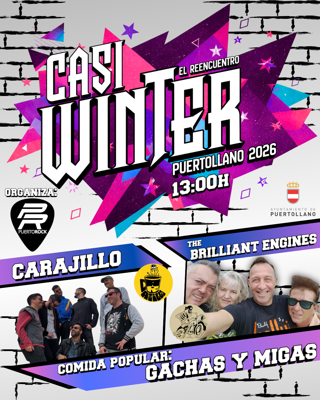 Después del fin de semana anterior al Winter durante los días 6 y 7 de marzo, también organizado por nuestra asociación, donde contaremos con un total de diez conciertos de grupos locales, el 14 de marzo a las 13:00 horas comenzará el Casi Winter en la plaza del pabellón de la Central. Contaremos con la banda madrileña de Rockabilly «The Brilliant Engines», con integrantes Puertollaneros, y la banda Chinchillana «Carajillo» perteneciente a nuestra asociación.