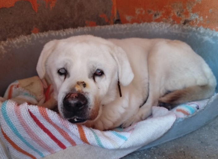 Ha llegado GUMI sin ni una sola vacuna puesta desde hace 11 años, ciego totalmente ya que en su vida ha ido a un veterinario para que le viera los problemas oculares por los que ha pasado, tiene cataratas, uveitis…. y la boca llena de infección.