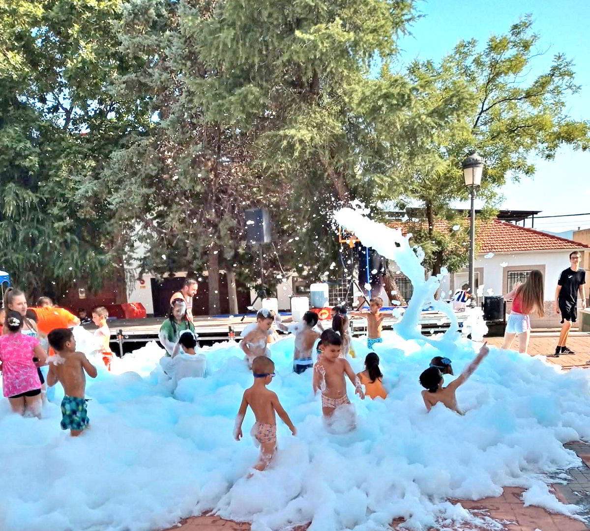 Los niños y niñas de la barriada Constitución de Puertollano han disfrutado de una fiesta de la espuma en la plaza de Donantes de Sangre como aperitivo a las fiestas de verano que se inician en la noche de este viernes. Desde un cañón se lanzó la espuma que en poco tiempo convirtió esta plaza en gran parque acuático a la que acudieron con gafas de baño, pelotas de playa, y que a buen seguro alivió las altas temperaturas que se padecen durante esta semana en Puertollano.