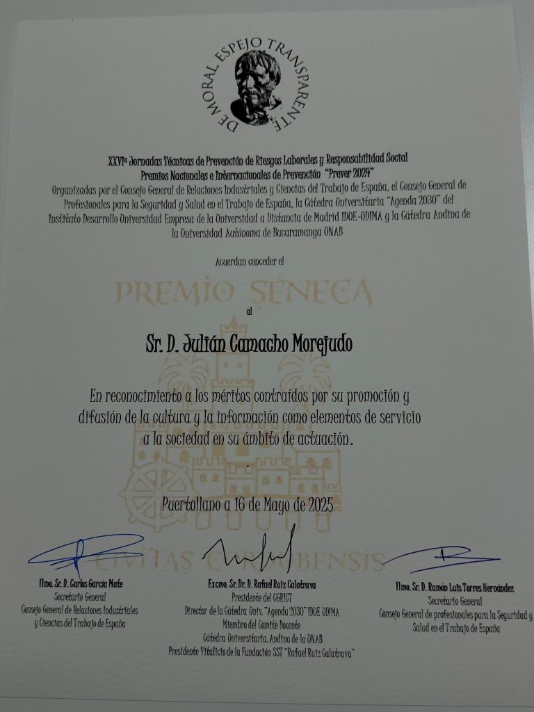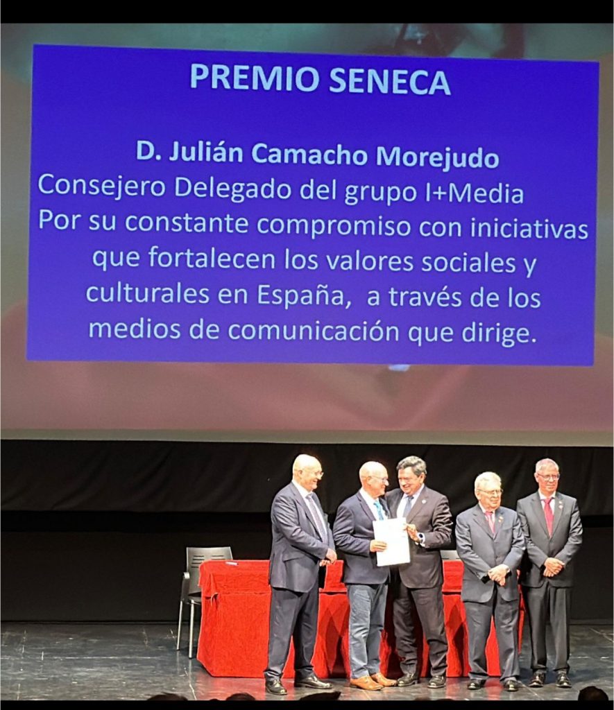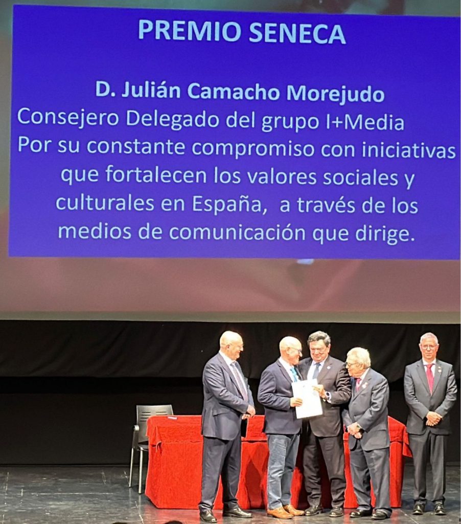 El Consejero Delegado del Grupo Imás Media (Imás Tv, Segmentos Tv, Imás Información y Onda Cero Puertollano), Julián Camacho Morejudo, recibió en la tarde del viernes 16 de mayo, en el Auditorio Municipal Pedro Almodóvar de Puertollano, el premio Séneca del CGRICT y ARQUICMA en las XXVI Jornadas Técnicas de Prevención de Riesgos Laborales y Responsabilidad Social, como reconocimiento a los méritos contraídos por su promoción y difusión de la cultura y la información como elementos de servicio a la sociedad en su ámbito de actuación.