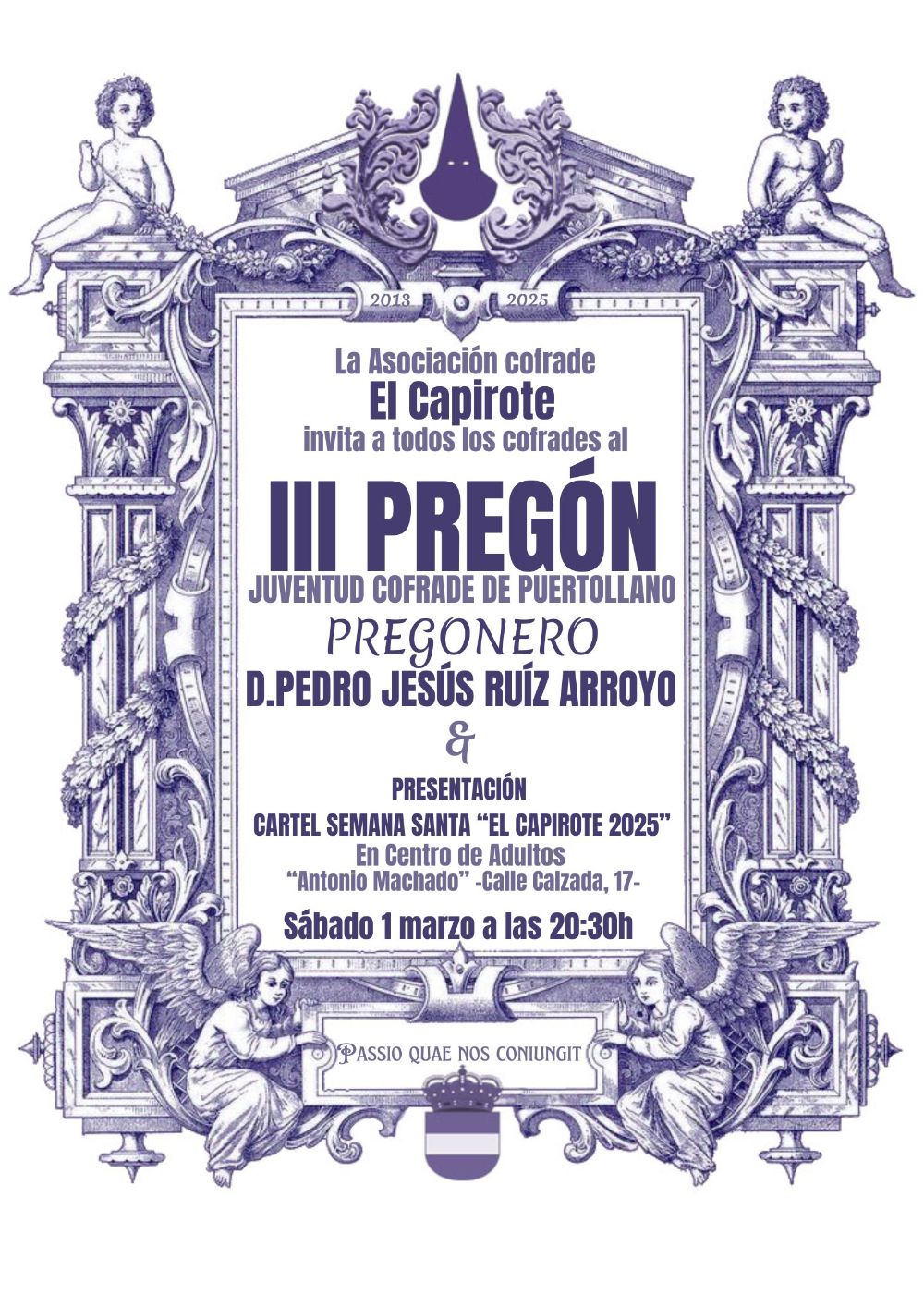 El cartel anunciador de la Semana Santa 2025, titulado «El Capirote 2025», ha sido diseñado por el reconocido pintor Adrián José Sánchez Retamosa. Según afirman desde la propia asociación, la obra promete no dejar indiferente a nadie y se convertirá en una pieza histórica tanto para la entidad como para el mundo cofrade de Puertollano. La asociación expresa su agradecimiento al autor, destacando el gran trabajo realizado y la excelente acogida que tuvo su designación como cartelista.