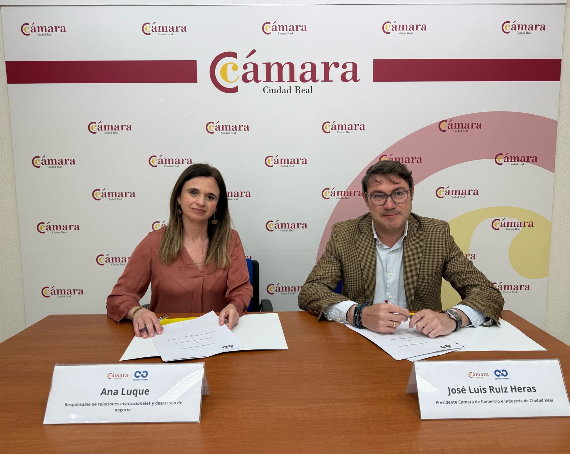 La firma ha tenido lugar en la sede de la Cámara de Comercio de Ciudad Real y ha contado con la presencia del presidente de la Cámara de Comercio, José Luis Ruiz y de Ana Luque, responsable de Desarrollo de Negocio de Cámara Certifica, la entidad de certificación y verificación del ámbito cameral.