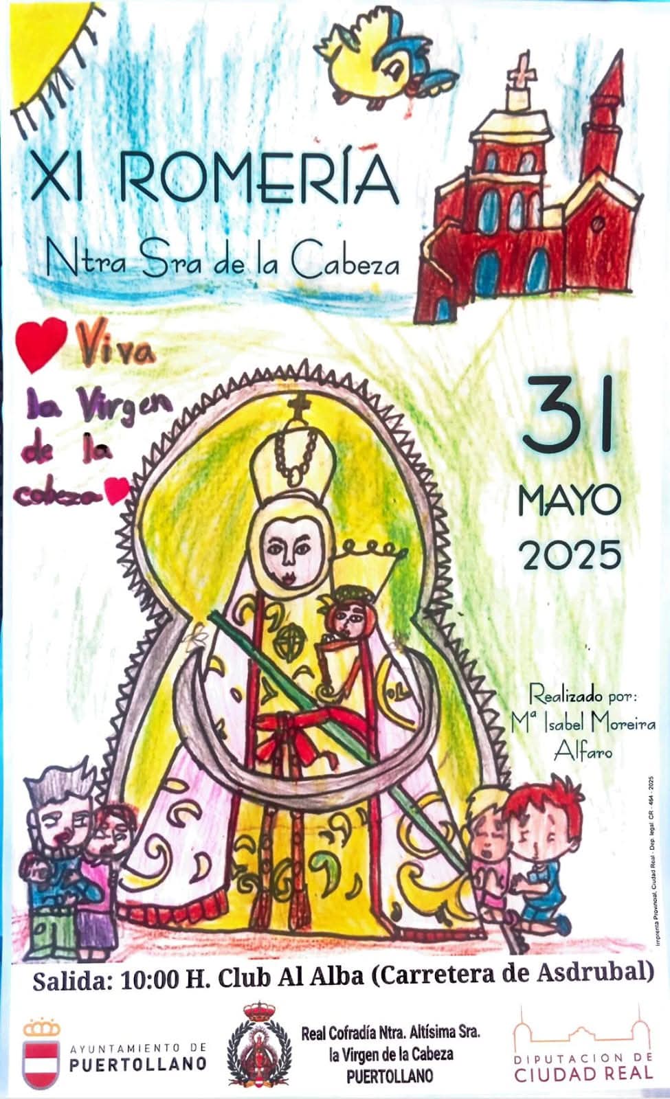 La Real Cofradía de la Virgen de la Cabeza celebrará la undécima romería el 31 de mayo, con salida desde el club Al Alba a las 10 horas, en la carretera de Asdrúbal. El cartel anunciador de este año ha sido dibujado por María Isabel Moreira Alfaro.