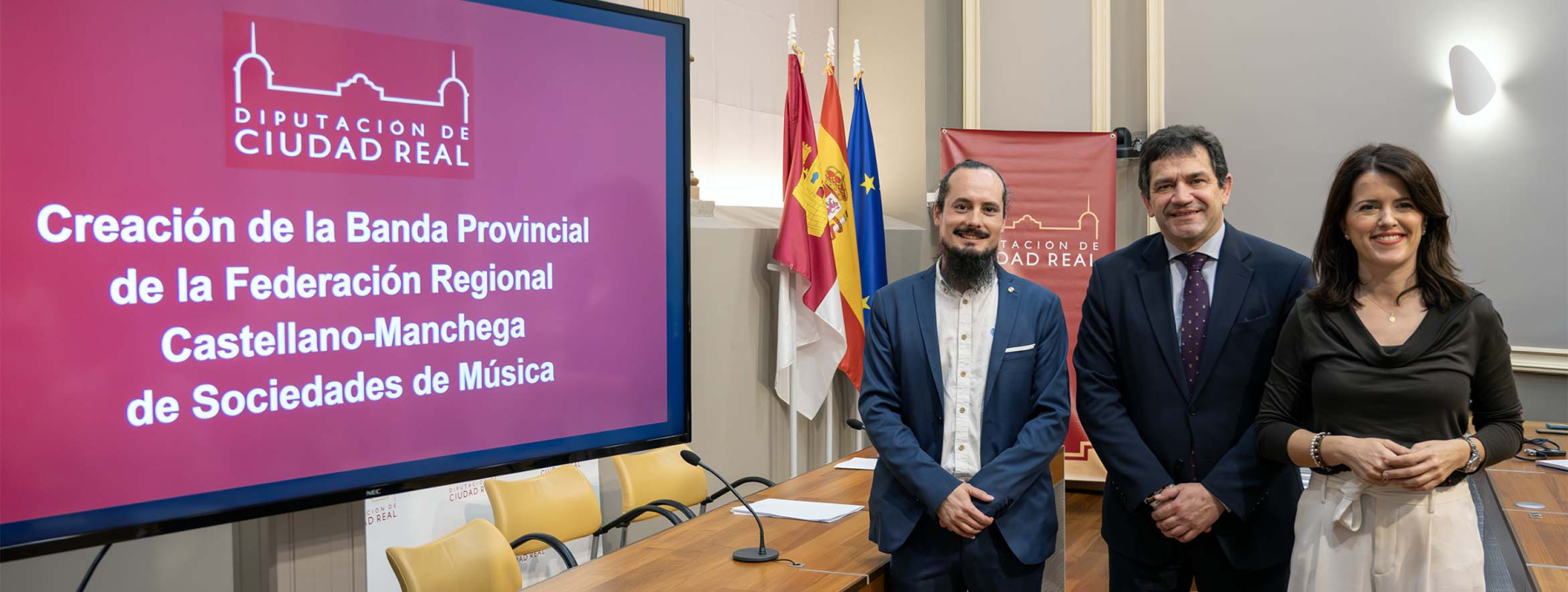 El presidente de la Diputación de Ciudad Real, Miguel Ángel Valverde, ha dado cuenta esta mañana de la creación de la Banda Provincial de la Federación Castellano-Manchega de Sociedades de Música, un proyecto pionero en el conjunto de la comunidad autónoma que ha impulsado la institución provincial. Lo ha hecho acompañado por la vicepresidenta primera, María Jesús Pelayo, y por Jorge Román, presidente de la federación promotora.
