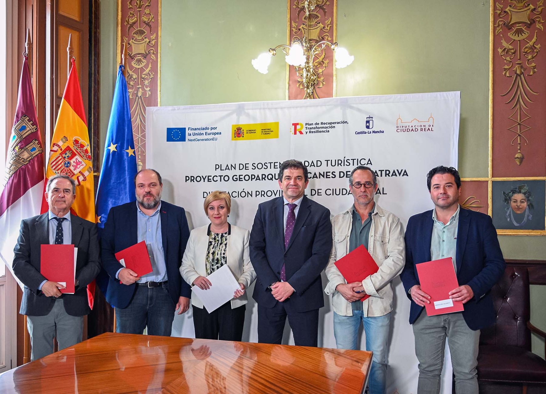 El presidente de la Diputación de Ciudad Real, Miguel Ángel Valverde, ha firmado esta mañana convenios de colaboración con los ayuntamientos de Aldea del Rey, Alcolea de Calatrava, Poblete y Pozuelo de Calatrava para la ejecución de diferentes actuaciones en geositios enmarcadas en el Plan de Sostenibilidad Turística del Geoparque Volcanes de Calatrava-Ciudad Real. Consisten en la instalación de luminarias solares en cuatro geositios reconocidos dentro de esta iniciativa, intervenciones, todas ellas, que apuestan decididamente por la eficiencia energética y la sostenibilidad ambiental al tiempo de que se contribuye a resaltar los entornos que se verán beneficiados. Suponen una inversión de medio millón de euros.