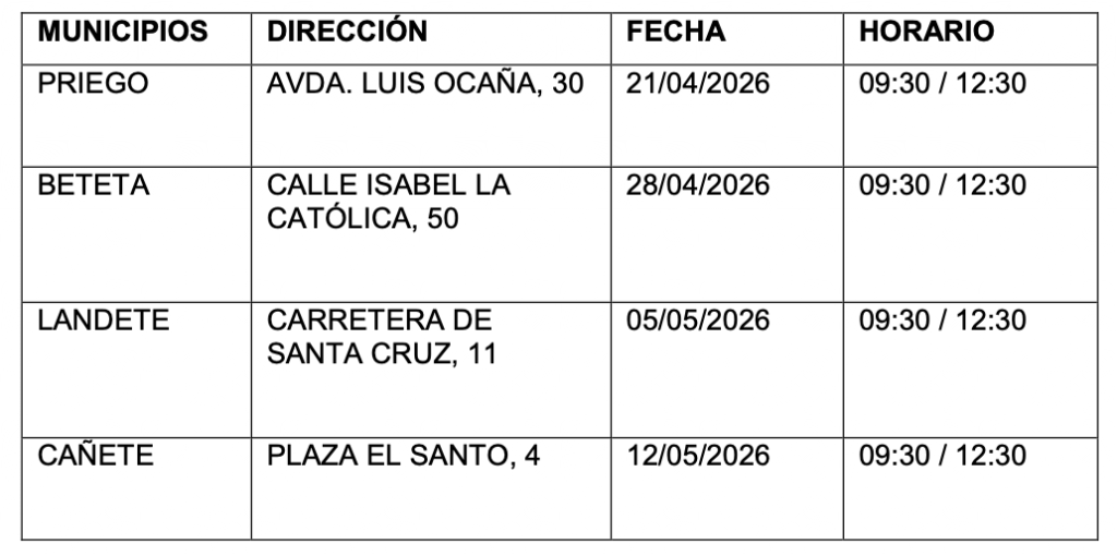 Por todo ello, desde la Guardia Civil de Cuenca, se ha elaborado un plan de desplazamiento a diferentes Unidades de la Guardia Civil, comenzando la atención durante estos meses de abril y mayo desde los siguientes municipios: