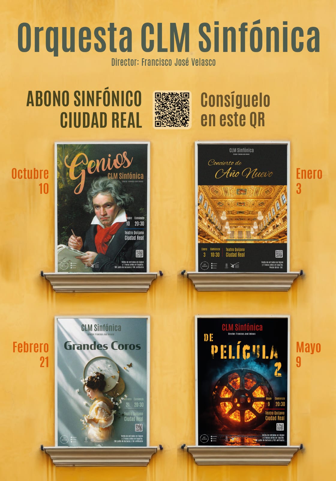 La concejalía de Cultura del Ayuntamiento de Ciudad Real ha programado cuatro conciertos de la Orquesta CLM Sinfónica en el Teatro Quijano, entre los meses de octubre de 2025 y mayo de 2026, con propuestas muy variadas: “Genios” el 10 de octubre, con la participación de Adrián Fernández como solista; el 3 de enero, “Concierto de Año Nuevo” acompañados por un coro infantil; el 21 de febrero, “Grandes Coros” de ópera y zarzuela; y “De película 2” cerrará el ciclo el 9 de mayo con bandas sonoras de conocidas producciones cinematográficas.