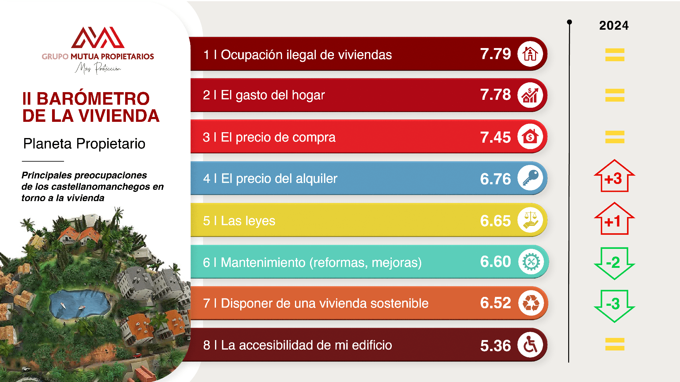 El ranking, realizado en base a las respuestas de más de 2.300 personas, puntúa los ‘gastos asociados al hogar’ con un 7,78, debido a “una estabilización de los precios energéticos y por las medidas de eficiencia implementadas en los hogares, y que podría revertirse próximamente ante la reciente subida del IVA en la factura de la luz”, explica López Demarbre. Mientras que el ‘precio de compra’ mantiene su posición, es de destacar también el ascenso de las ‘leyes de la vivienda’ que se sitúan como quinta mayor preocupación de los castellanomanchegos.