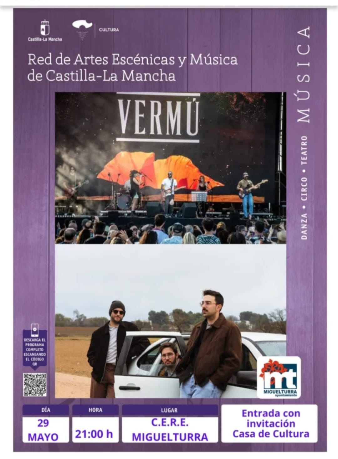 Anselmo Alañón Alcaide.– El grupo musical «Vermú » actuará el próximo 29 de mayo en el CERE de Miguelturra, actuación incluida en la Programación de Artes Escénicas, para esta primavera 2026. «Vermú» es una formación musical de tendencia pop-rok, procedentes de Albacete, que debutó en la escena musical en 2018 con un EP homónimo, al que siguió su primer LP, «Cancionero Estoico», en 2020.