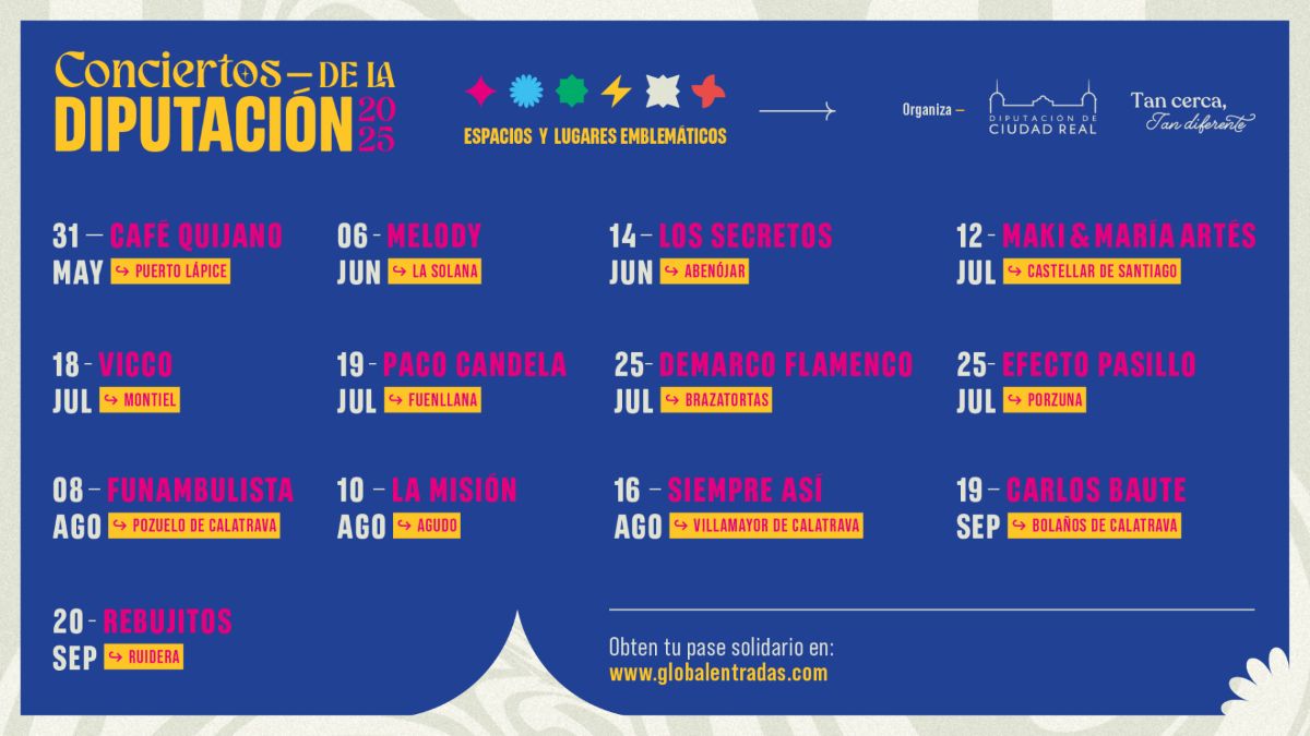 El concierto tendrá lugar este próximo sábado, 12 de julio, a partir de las 22:00 horas en la Plaza de Toros de Castellar de Santiago, y contará con la actuación previa del grupo de la tierra “Corazón Oxidado”. Los conciertos de la Diputación de Ciudad Real sirven para que nuestros pueblos muestren sus potencialidades y para que la cultura, a través de la música, sirva de vínculo entre todos los ciudadanos. Una iniciativa que en esta edición, por primera vez, están todas las comarcas representadas y que sirve para remarcar las singularidades que atesora la provincia y para impulsar las economías locales.