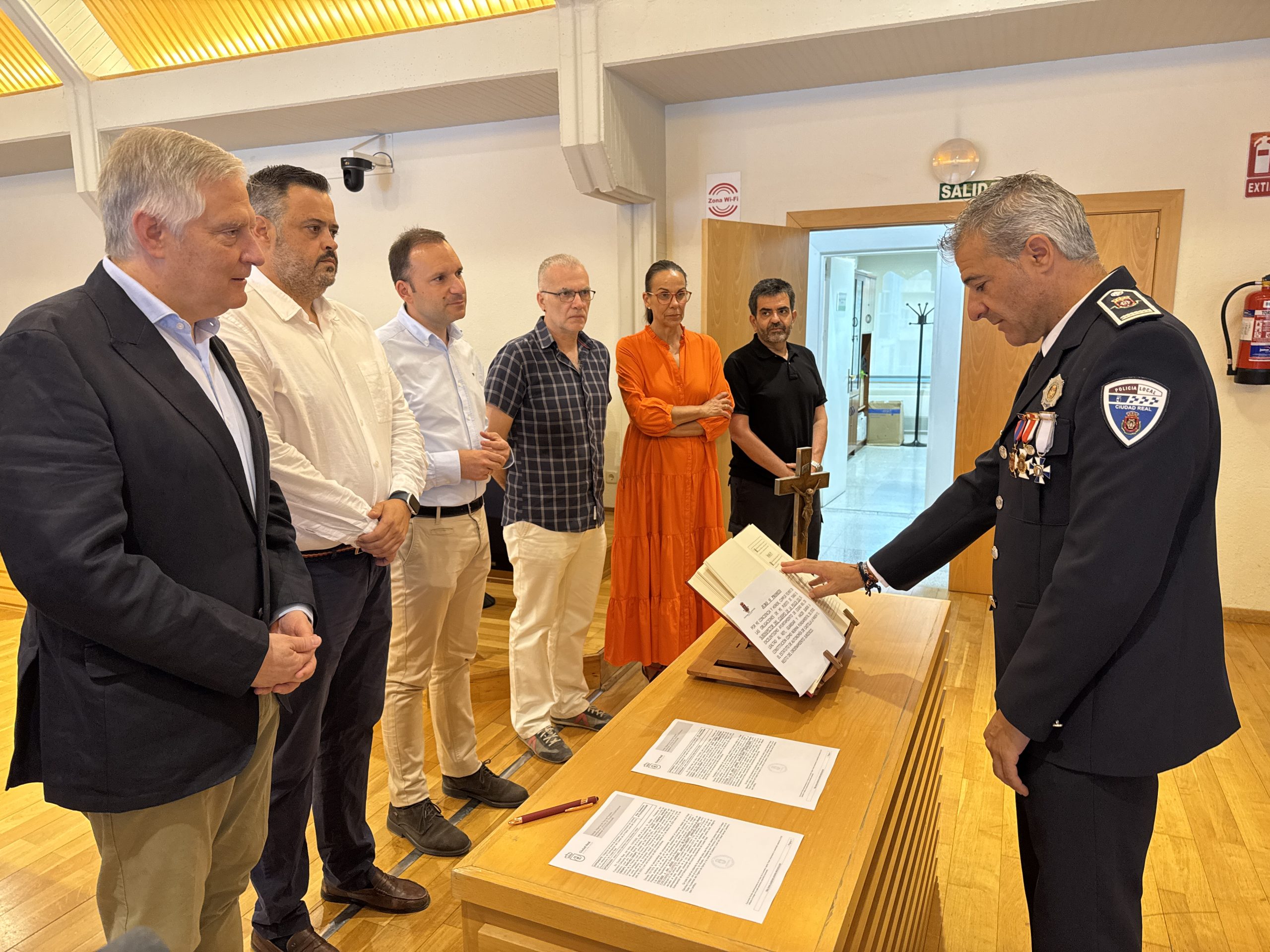 El salón de plenos del Ayuntamiento de Ciudad Real ha acogido el acto de toma de posesión de Jesús Lorenzo Sánchez-Crespo como subinspector de la Policía Local de Ciudad Real, en una ceremonia a la que han asistido el alcalde, Francisco Cañizares, el concejal de Seguridad Ciudadana, Miguel Hervás, y el concejal de Personal, Guillermo Arroyo. Con este proceso, ha señalado Miguel Hervás, el grupo municipal de gobierno sigue ratificando su compromiso con el cuerpo de Policía Local no sólo con la incorporación de nuevos agentes sino también, como es el caso, con la posibilidad de promoción interna.