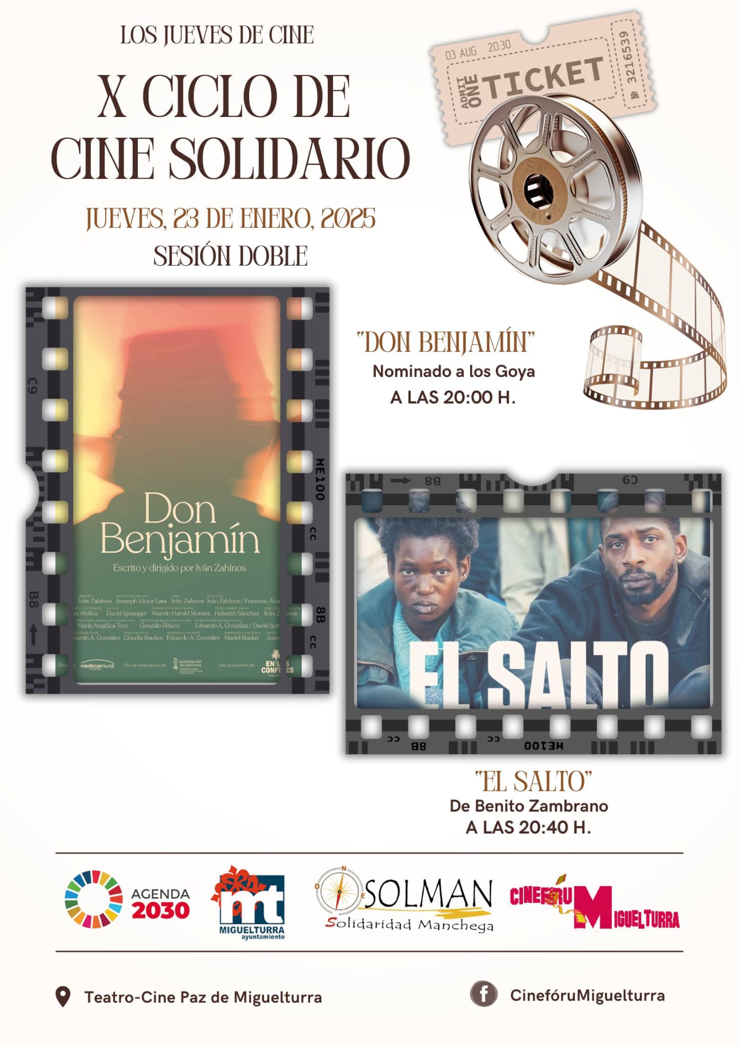 Eduardo Muñoz Matínez.- Este jueves, día 23, continúa en Miguelturra el «Décimo ciclo de Cine Solidario». El programa es una sesión doble que se proyectará en el Teatro Cine Paz, a partir de las 20:00 horas. La organización corre a cargo de SOLMAN, – Solidaridad Manchega -, en colaboración con el Ayuntamiento miguelturreño, a través de la Agenda 2030 y CineforuMiguelturra. En concreto, la velada nos ofrece el documental «Don Benjamín», nominado a los Goya, y la película «El salto», de Benito Zambrano, que está previsto a eso de las 20:40 horas.