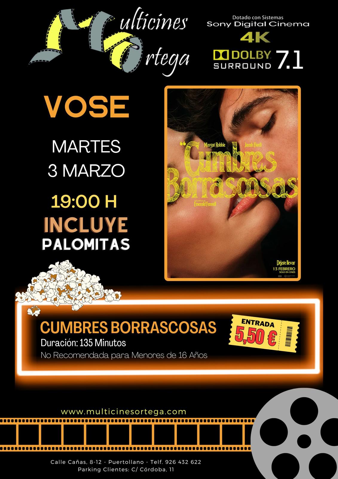 Multicines Ortega de Puertollano proyectará el próximo martes, 3 de marzo, la taquillera película «Cumbres borrascosas» en versión original subtitulada al español, en un pase especial a las 19.00 horas que incluirá palomitas. El precio de la entrada será de 5,50 euros.