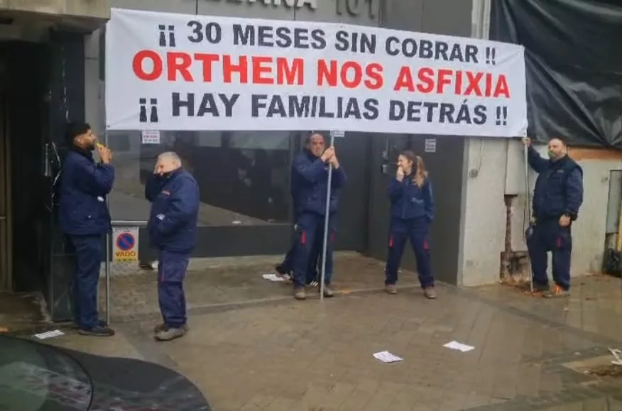 Un grupo de trabajadores de Marfiluz acompañados de una representación de la empresa puertollanense han hecho por sus reivindicaciones en la sede de Orthem en el Paseo de la Castellana en Madrid al grito de frases como «Queremos cobrar» y «Orthem constructora y estranguladora», según informa Julián Gómez.