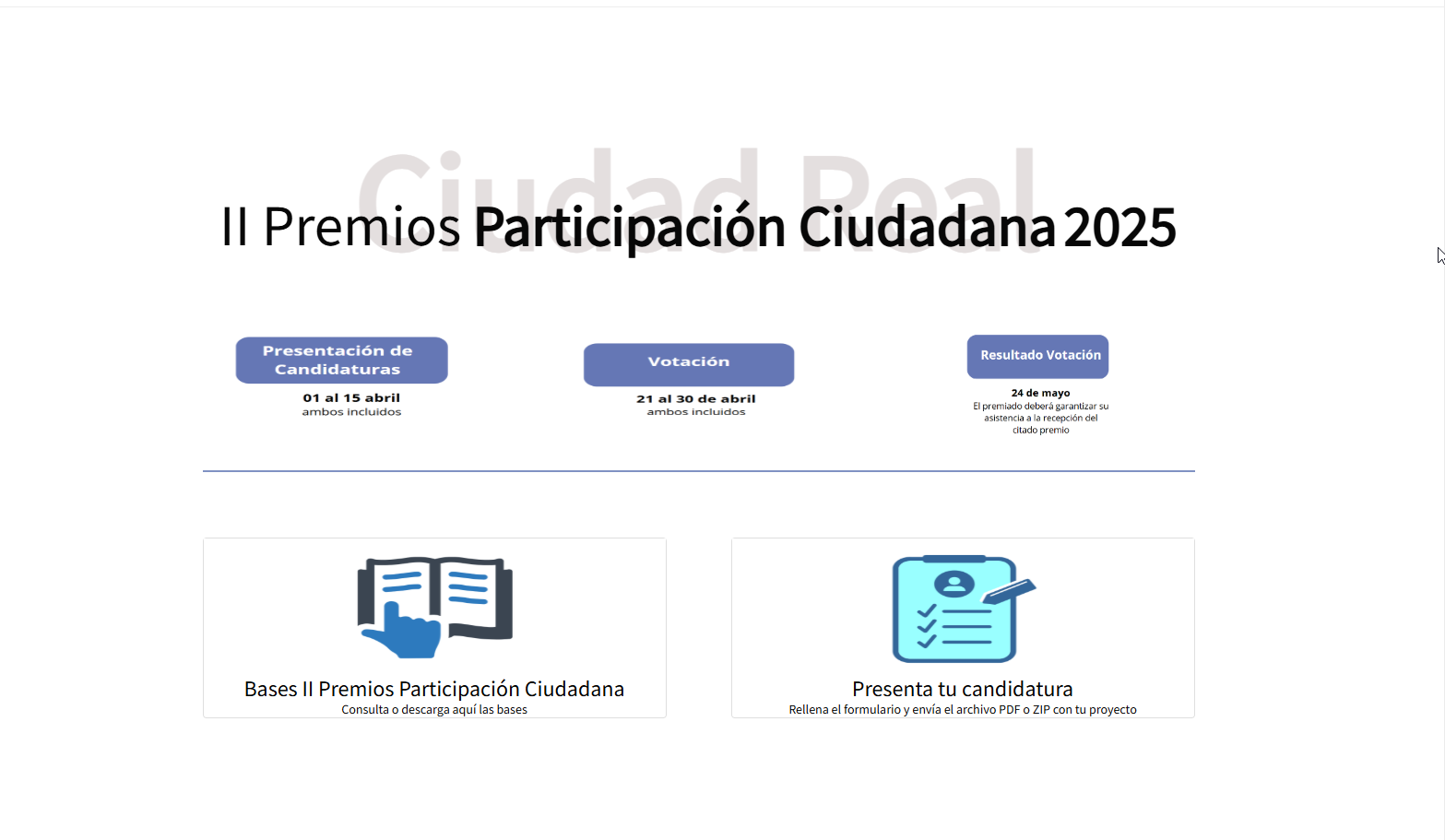 El Ayuntamiento de Ciudad Real ha lanzado una nueva edición de los Premios de Participación Ciudadana, una iniciativa con la que se pretende reconocer el esfuerzo, la dedicación y la creatividad de las asociaciones y colectivos del municipio. La convocatoria, abierta del 1 al 15 de abril, está dirigida a entidades inscritas en el Registro Municipal y contempla dos modalidades: una dedicada a entidades ejemplares en materia de participación ciudadana, y otra destinada a proyectos o acciones innovadoras que hayan tenido un impacto positivo en la comunidad.